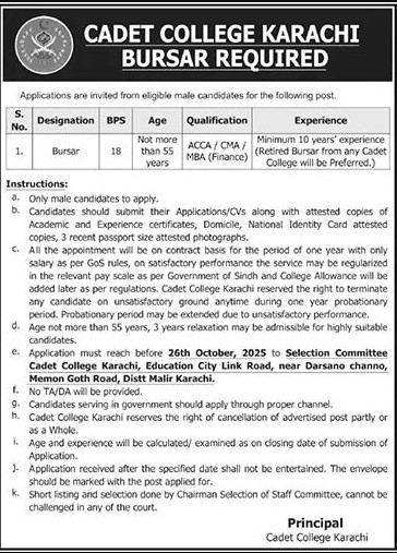 Candidates, if you are seeking Bursar Cadet College Jobs In Karachi October 2025, Apply Online if yes. It would be best if you tried to complete the Bursar Cadet College job because you can easily apply for these vacancies Bursar. Only male candidates can apply for Bursar Cadet College Jobs In Karachi October 2025. Apply Online. Qualification /Experience Required: ACCA/CMA/ MBA (Finance) (Retired Bursar from any Cadet College will be preferred.)and more experienced candidates should apply before 26 October 2025.